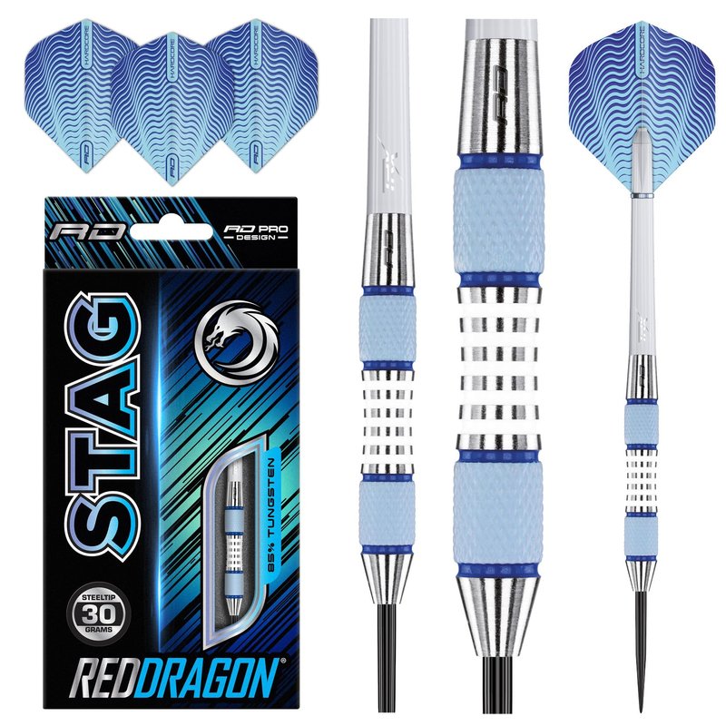 Set of 3 x 30g - 85% premium quality Red Dragon tungsten darts; Red Dragon stems - Designs may vary; Red Dragon flights; Stags are made with precision grip and finished in striking blue, white and grey; Stag are available in 21g, 24g, 25g, 26g, 27g, 28g, 29g & 30g weights