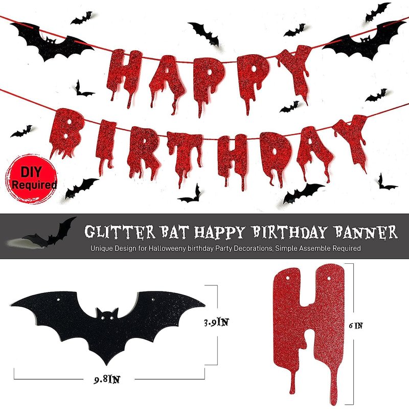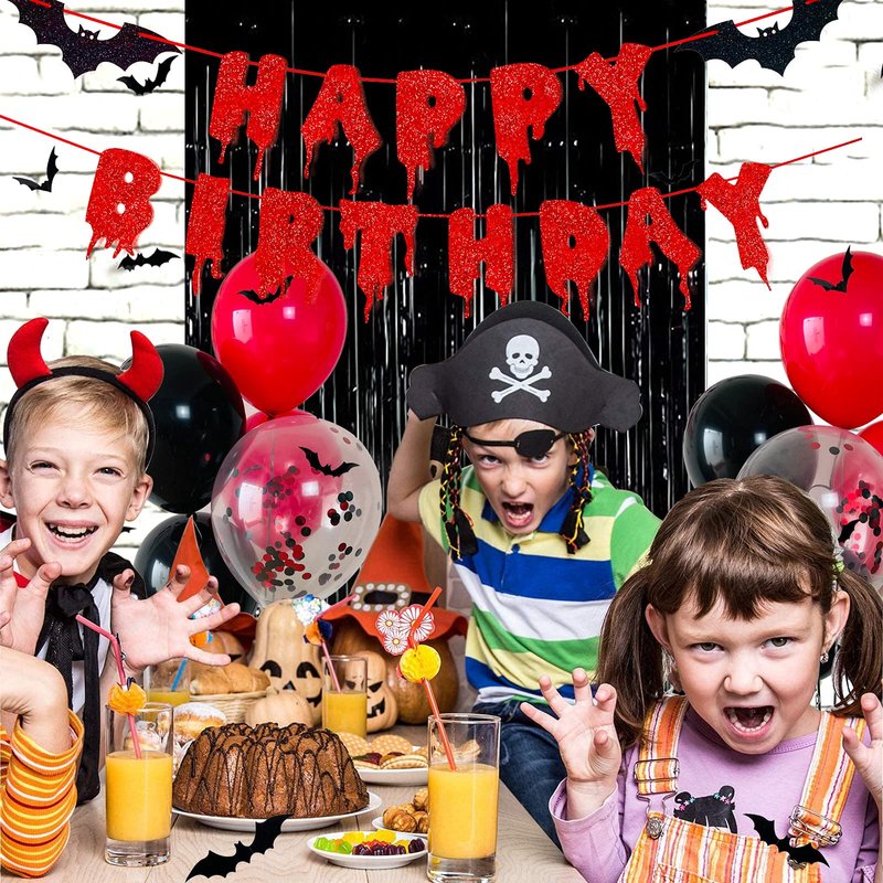 Red Glittery Happy Birthday Halloween Banner Black Foil Curtains Backdrop 3D Bat Sticker and Latex Balloons Confetti Balloon for Birthday Party Decorations Scary Party Supplies