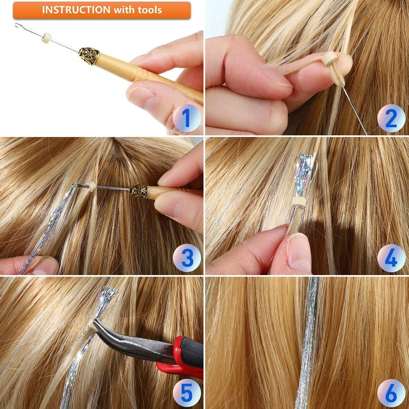 Package Includes: 47 Inch 1000 strands hair tinsel. 5 bundles are fold packaged separately, total 1000 strands. Includes 1 piece crochet, 1 piece hair clips, 100 pieces (Black + Brown+ Blonde) silicone micro beads. High Quality Material: These hair strands are made of high temperature wire. Safe, tasteless and will not fade. They can be washed, blow-dried and combed. Easy to Use: Using our installation guide in the picture, Can easily change your hairstyle. Tinsel hair can last several weeks. If you want to remove, just use scissors to cut the knot. Not only used on hair, but also you can use it to do your fingernail, These shimmering hair strands can make you more dazzling.