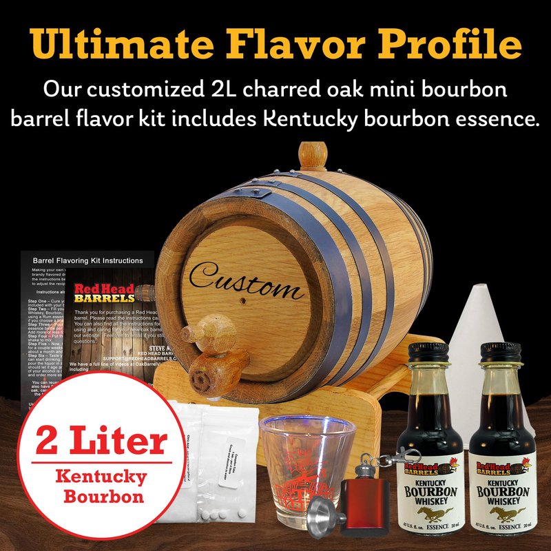 Red Head Barrels - 2 Liter Custom Engraved American White Oak Aging Barrel with Flavoring Gift Set, Free Shot Glass, Premium White Oak Wood Barrel & Homebrew Kit (Kentucky Bourbon)