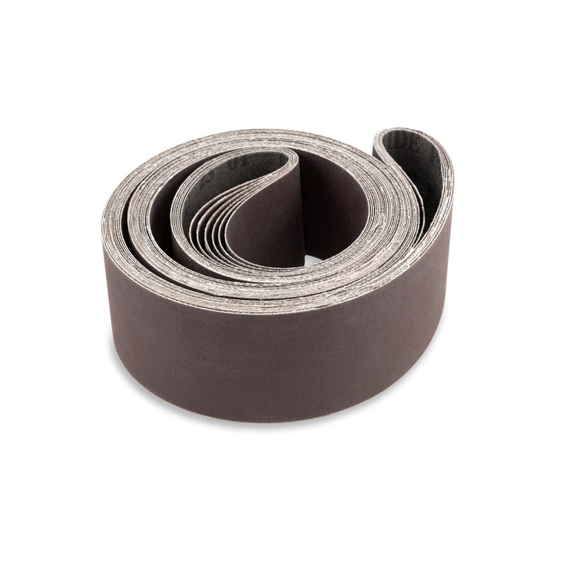 2 1/2" X 16" 60 Grit premium inudustrial quality general purpose Aluminum Oxide sanding belts. Sold in packs of 6. Premium open coat, heavy X weight cloth Aluminum Oxide (A/O) backing offers a High quality and long lasting cut that works great on wood (hardwood and softwood), nonferrous metal, plastics, etc. Great for general purpose use. Open coating and imbedded top coat resists loading. Bi-directional tape joint. Dry applications. Assembled in USA.