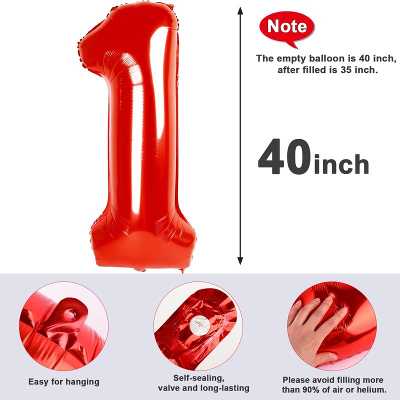 Red One Number Balloons 40 Inch First Birthday Decorations for Boy, Big Mylar Foil Helium Balloon for Super Mario Birthday Party Supplies, Roblox Birthday Decorations