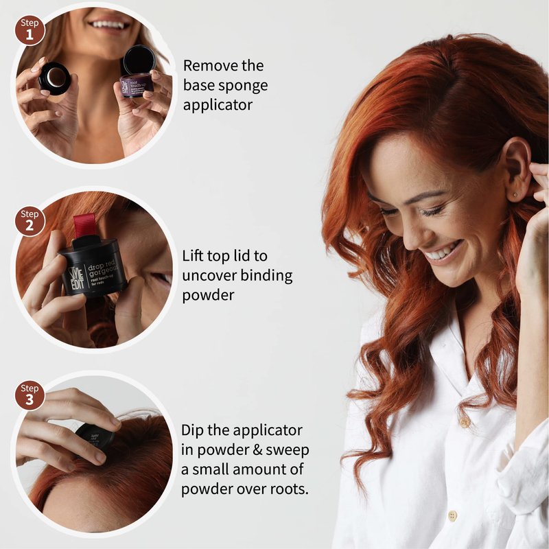 - HAIRLINE POWDER FOR DARK RED HAIR Color-adaptive pigments and unique binding agents glide smoothly over roots to lock in color and shine. Drop Red Gorgeous Root Touch Up for dark red hair is good for all hair types and textures.