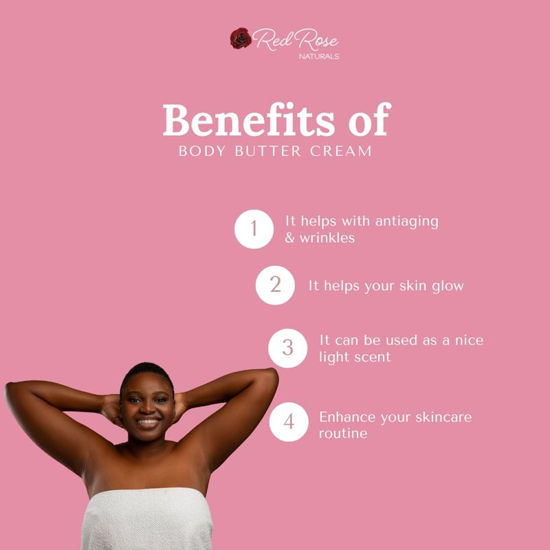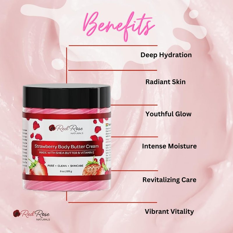 - Natural Ingredients: Every jar of Red Rose Naturals Strawberry Body Butter Cream is carefully crafted with love and dedication. It is free from harsh chemicals, parabens, and artificial additives, making it suitable for all skin types, including sensitive skin. The natural ingredients in this product work in harmony to nurture and restore your skin's natural vitality, promoting a healthy and radiant appearance.