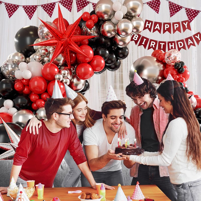 - Package Includes:The red and black balloon arch kit includes 36pcs red balloons 18inchx1, 12inchx5, 10inchx10, 5inchx20, 37pcs black balloons 18inchx2, 12inchx5, 10inchx10, 5inchx20, 21pcs metallic silver balloons 10inchx10, 5inchx10, 20pcs white balloons 10inchx10, 5inchx10, 12inch silver confetti balloonsx8, 22inch foil balloonsx3, glue dotsx60, black ribbonx1,decorative stripx1
