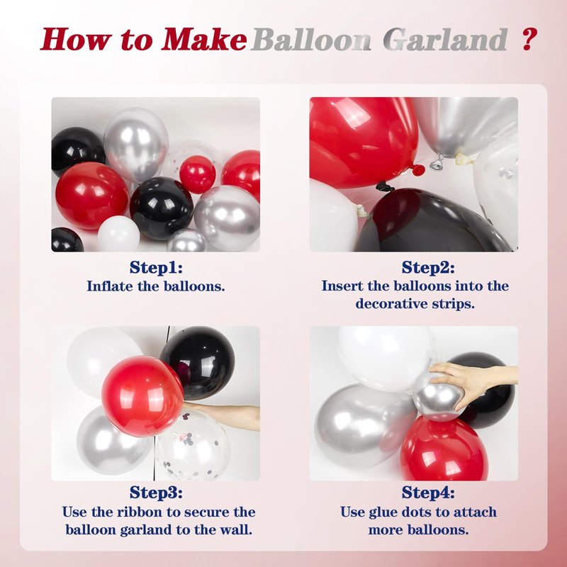- Ease of Assembly:Our red and black balloon arch kit have ribbon, glue dot, decorative strip to help complete balloon arch kit more easily. first, Inflate the balloons with pump, crossing each other to form some balloon clusters. Then, insert the balloon knot into the decorative strip hole, or tie them together with ribbon to form balloon arch. Finally, hang it on the party backdrop, use glue dots to attach 5 inch balloons to fill gap area
