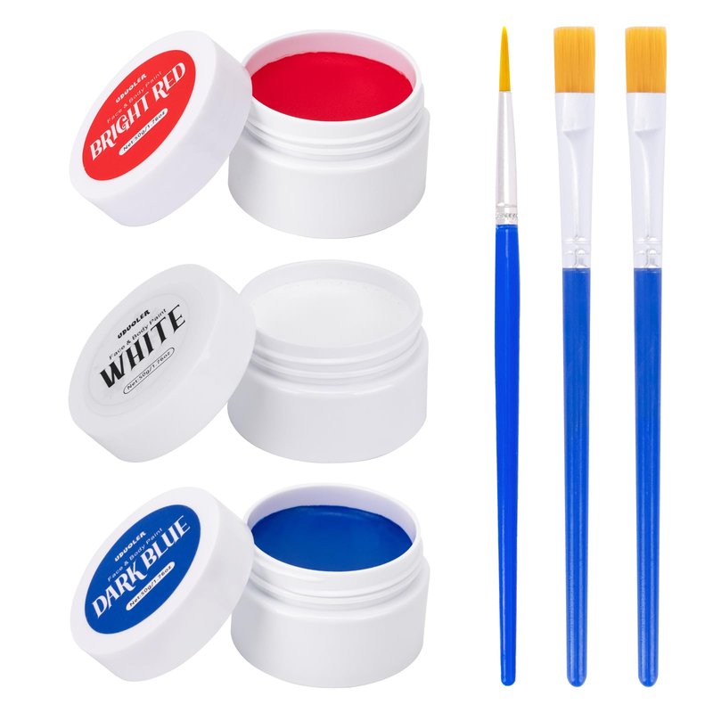 - Red White And Blue Face Paint Kit:Comes with white face paint(Net Wt.50g/1.76 oz), blue face paint(Net Wt.50g/1.76 oz),red face paint(Net Wt.50g/1.76 oz),3pcs Artist Brushes. Large-capacity design can meet your more needs, it can be used for face and body.