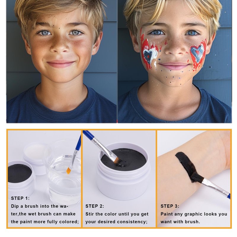 - Professional Water Based Face Body Paint:Safety meets perfection with our water-based Halloween face paint kit. Designed with a gentle formula, it's ideal for prolonged wear without irritating the skin. The water-based nature ensures a smooth application, giving you an even coverage and a comfortable wear throughout your event. Say goodbye to heavy, cakey makeup and embrace our lightweight, breathable face paint that feels as good as it looks.