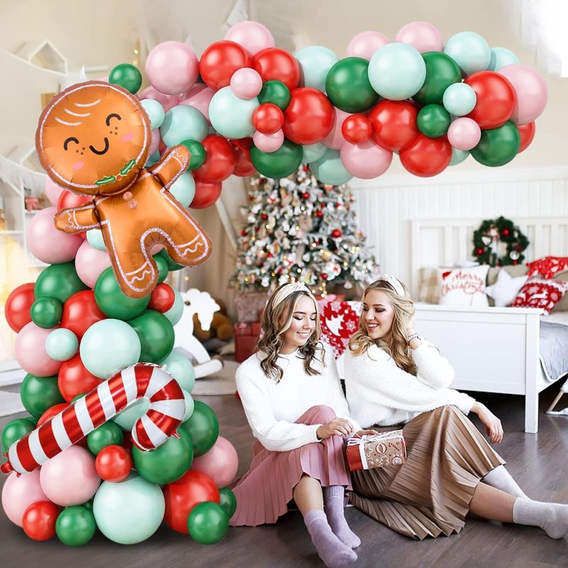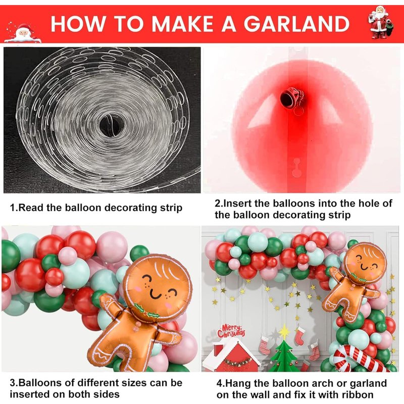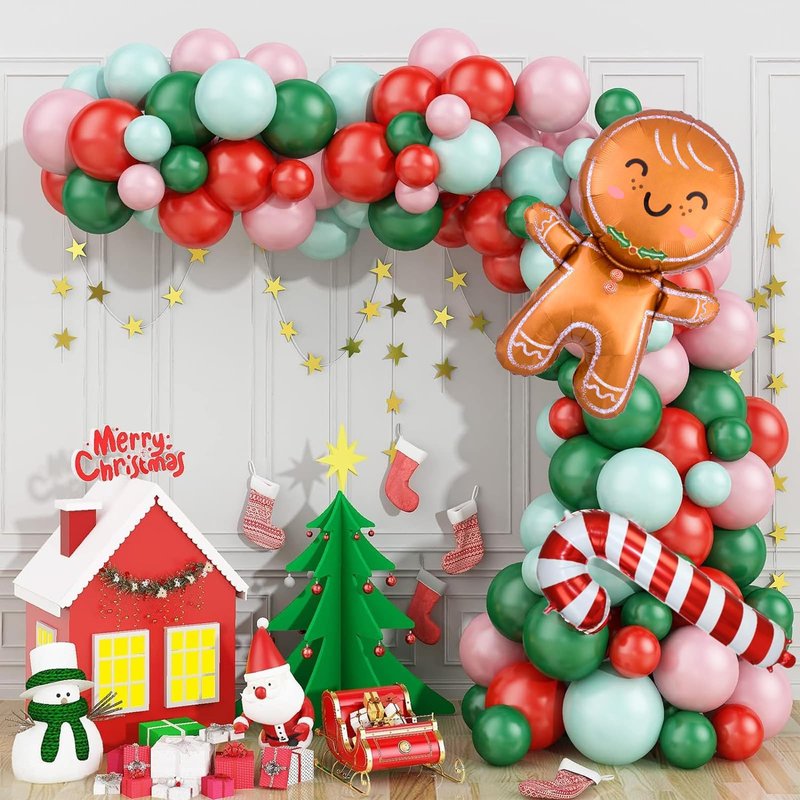- Christmas Balloons Garland : include 10inch: 15x red,15x dark green, 10x macaron green, 10x light pink; 5inch balloons: 10inch: 10x red,10x dark green, 10x macaron green, 10x light pink, 1x gingerbread man aluminum film balloon, 1x large christmas candy cane,1 x balloon chain; 1 x dispensing. Various sizes balloon can make your balloon arch look more layered.