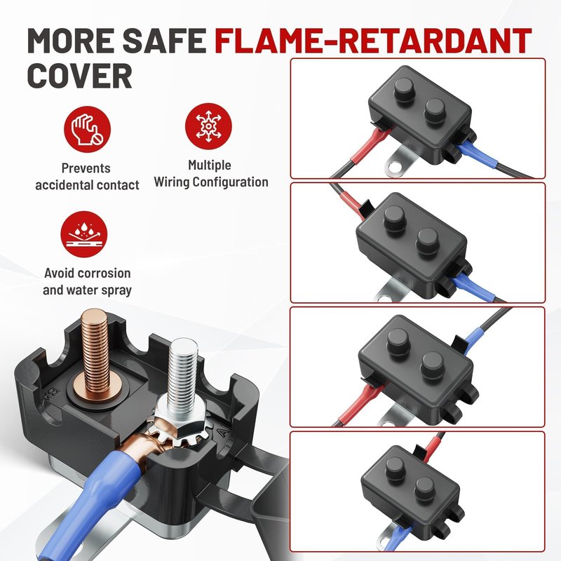 - Pre-trimmed Flame-retardant Cover: PVC cover with flame-resistant material for higher safe grade; Not completely waterproof, but good enough to keep corrosion and water spray down to a minimum; Allow terminals to mount in 4 orientations