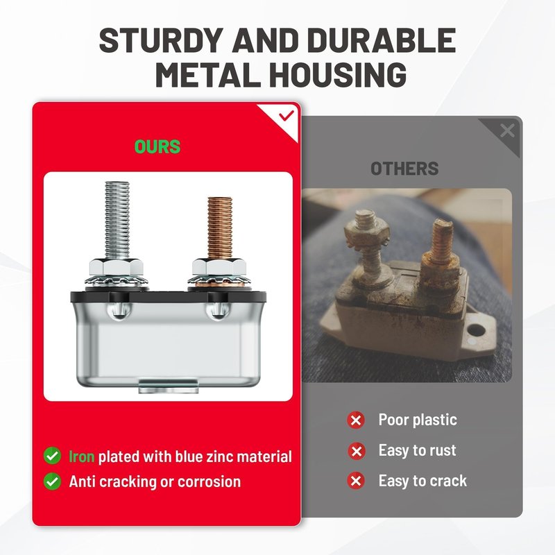 - Durable Metal Fuse Breaker: Fuse housing is made of iron plated with blue zinc, more sturdy than plastic; Copper studs and stainless-steel nuts for excellent conductivity; PPT plate comes with good insulation; Transverse metal mounting bracket provides stable installation and ensures safety