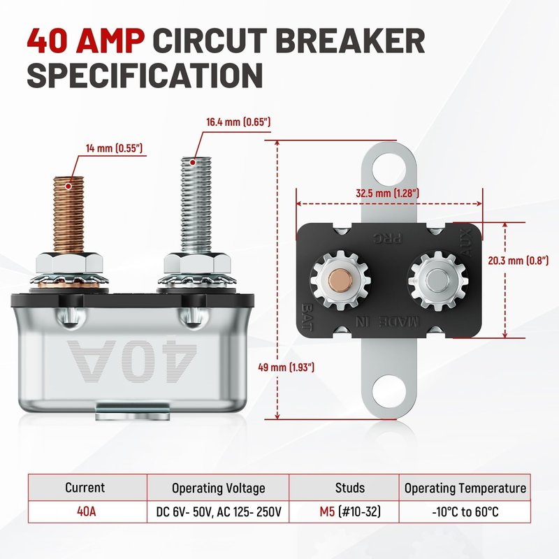 - Automotive Reset and Reusability: 40A Circuit breaker features automatic reset function when overheating; When the circuit is overloaded/short-circuited, self-resetting fuse can protect the power supply; NO worry of fuse burnout; Can be used repeatedly, save money in the long run for not having to buy fuses all the time