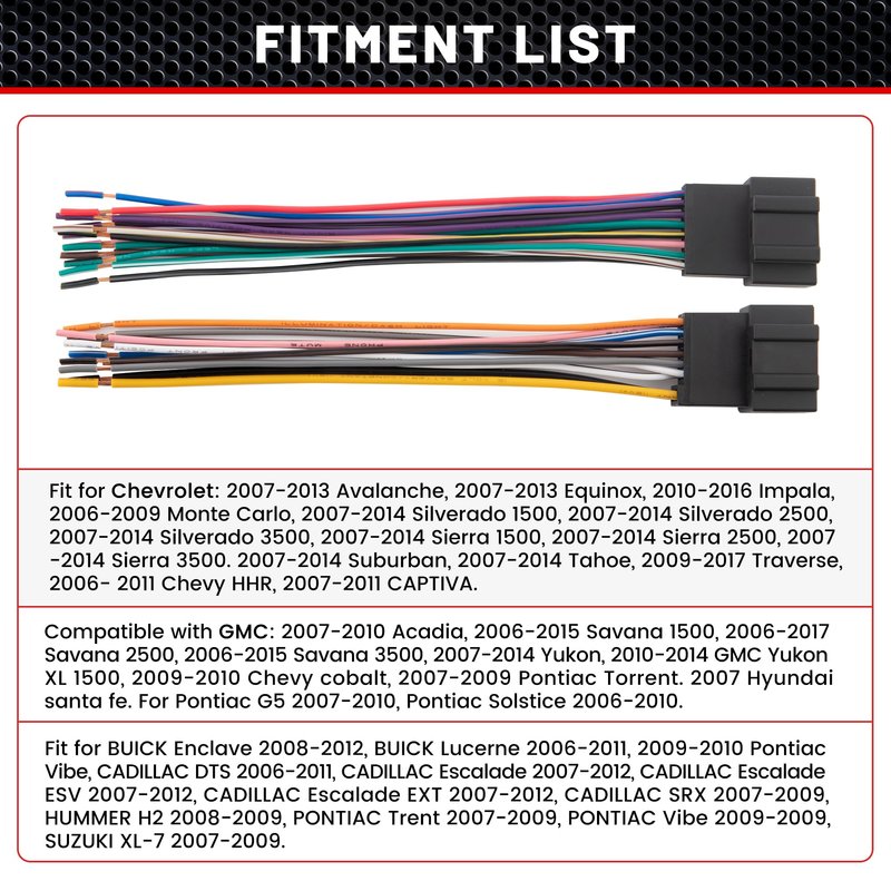- Radio wiring harness w/antenna adapter compatible with Chevrolet: 2007-2013 Avalanche, 2007-2013 Equinox, 2006-2016 Impala, 2006-2009 Monte Carlo, 2007-2014 Silverado 1500, 2007-2014 Silverado 2500, 2007-2014 Silverado 3500, 2007-2014 Sierra 1500, 2007-2014 Sierra 2500, 2007-2014 Sierra 3500. 2007-2014 Suburban, 2007-2014 Tahoe, 2009-2017 Traverse, 2006- 2011 Chevy HHR, 2007-2012 CAPTIVA. 2009-2010 Cobalt,