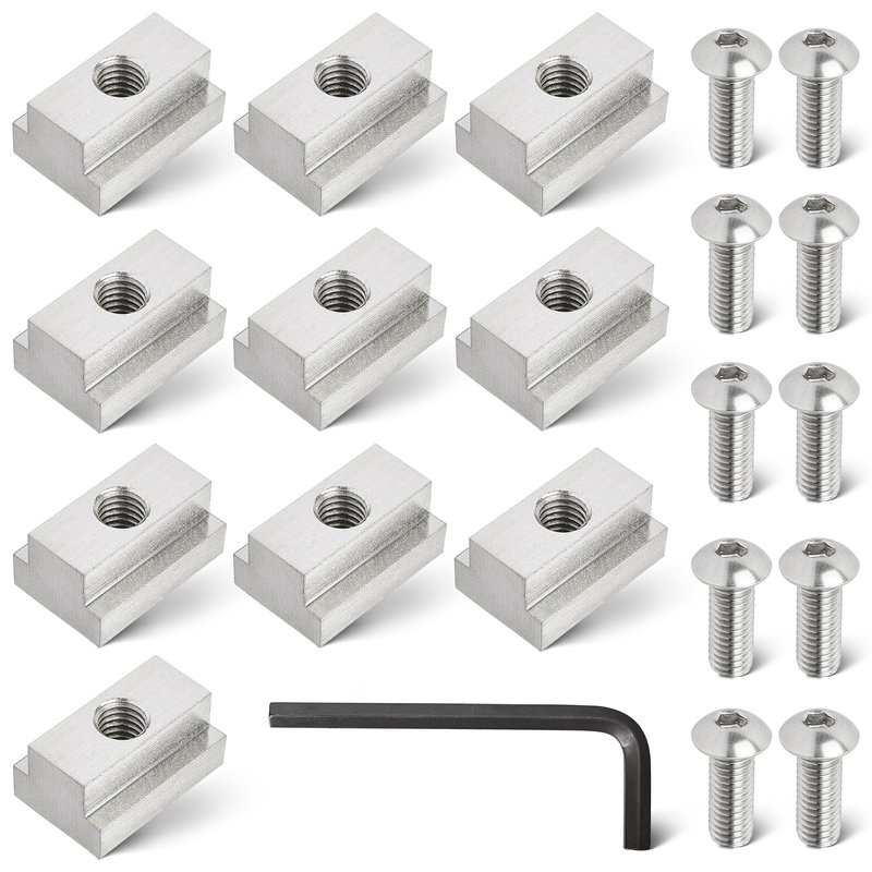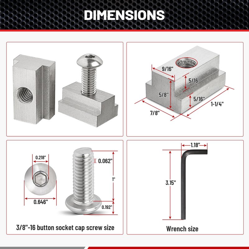 - 🔧 What you get: 10 x T-slot nut; 10 x button head socket cap screw 3/8"-16 and 1 x wrench. Specification: T-slot nut thread 3/8"-16. Base size 1-1/4" L x 7/8" W x 5/16" H. Protruding size: 1-1/4 "L x 9/16" W x 5/16 "H. Total height 5/8". Before purchasing, please measure the size of your bed rails to ensure it is approximately the same size as the product.
