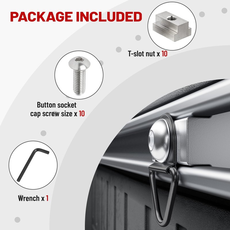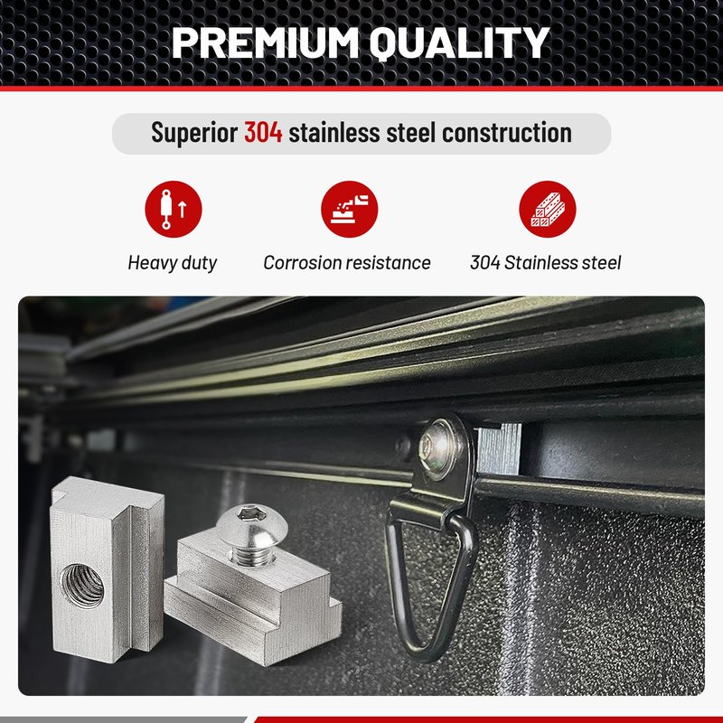 - 🔧 Feature: 3/8"-16 T-slot nuts allow you to add side bed storage, attach a hub lock bracket or go to mount a toolbox without drilling holes in the floor of the bed which perfectly for all the different type of loads what you need to tie down. Can be mounted extra custom cleats, tie downs, D-rings, V-rings, Cargo Motorcycle, bike racks and more.