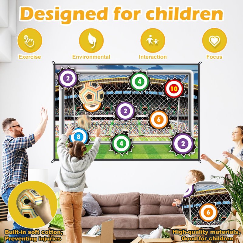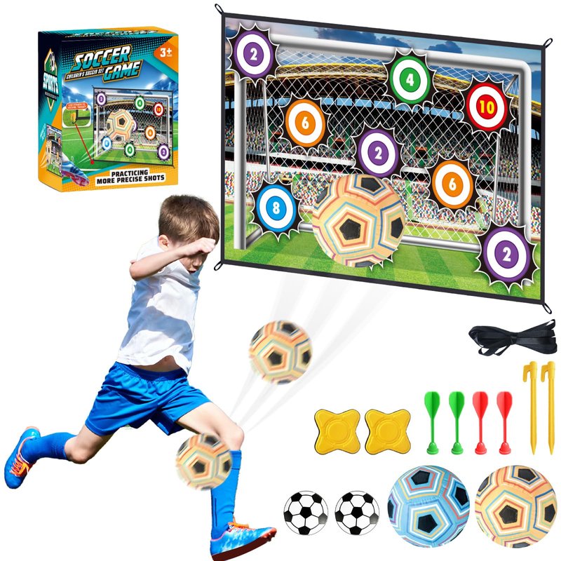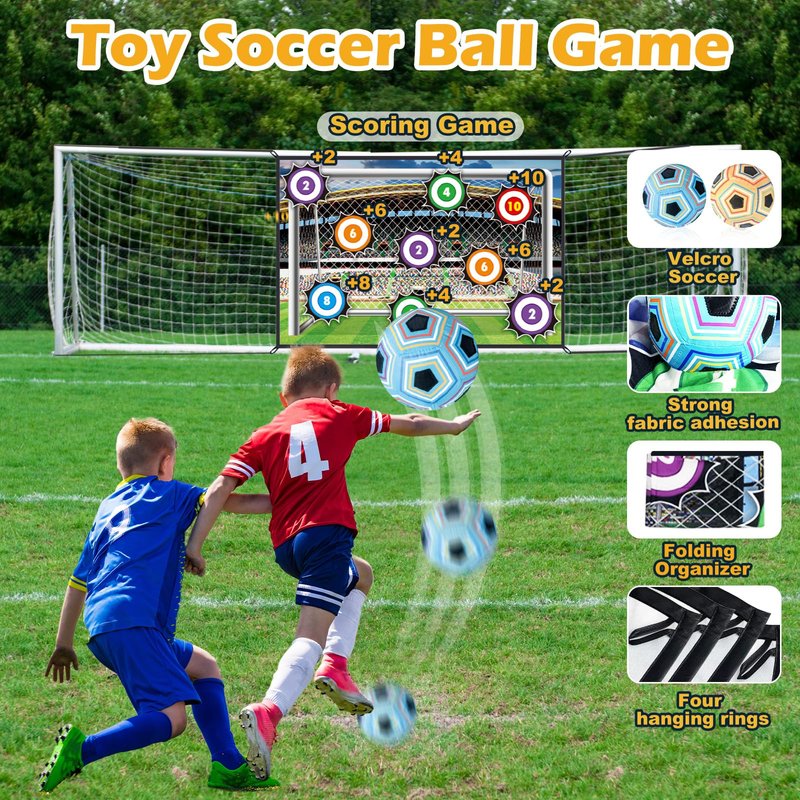 - Multiple Play Options: Challenge friends,parents to a competitive toy soccer game with fun scoring! Kick or throw the soft soccer balls, Ninja Star or dart at the fabric goal mat, and watch as they stick to the targets. This versatile set fits perfectly into any playground game system, providing hours of entertainment and soccer skill-building for children