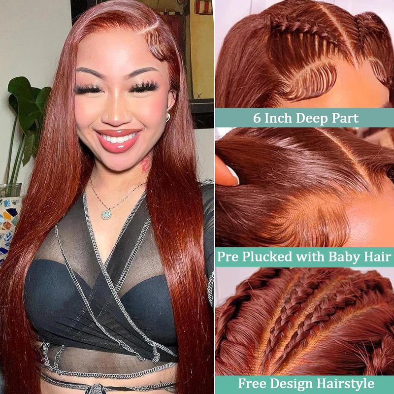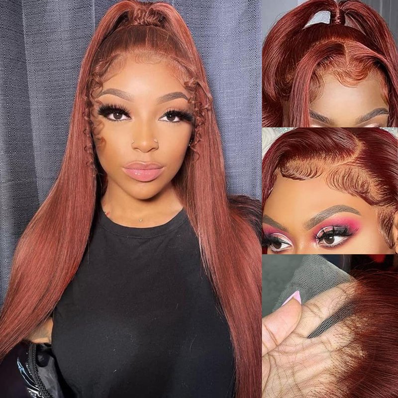 - Reddish Brown Wig Human Hair with Natural Hairline: Straight Lace Front Wigs Human Hair pre plucked with baby hair. More natural and beautiful. HD Transparent Lace can be well suited for all kinds of skin, 13x6 Large Area Lace can make side part, middle part, and High Ponytail and Bun. 33B Reddish Brown wigs human hair show your beauty.