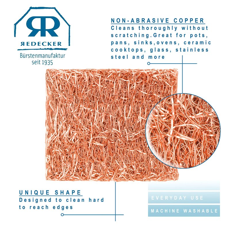 - Superior cleaning power - Redecker's copper thread mini scrubber gives you the power to clean small surfaces, edges and corners with ease. This non-abrasive cleaner ensures that it won't damage surfaces, yet its copper thread allows for more effective scrubbing than traditional scrubbers. Get superior clean today with the Redecker copper scrubber.