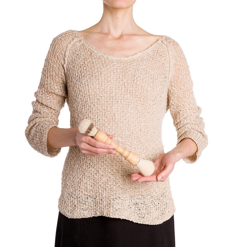 An all-surface cleaning assistant, the Redecker Double Dust Brush with Goat Hair and Pig Bristles Brush Heads gently-yet-thoroughly cleans filth from your furniture.