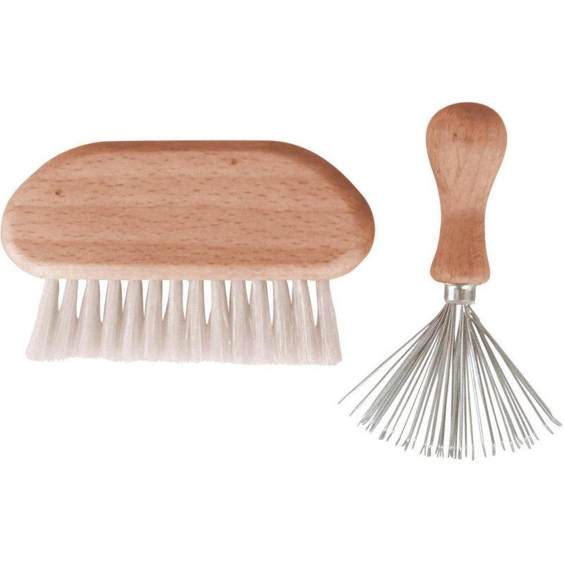 Remove unwanted hair and buildup from any hairbrush regardless of size or shape with this efficient brush cleaning set. Includes 1 pig bristle brush for removing dust and fluff along with 1 wire brush for eliminating knotted clumps and loose strands from your hairbrush. Soft pig bristles are gentle and won't damage hairbrush pins. The tightly-woven wire pattern of the wire brush effectively latches onto pieces of hair. Handles made from all-natural oiled beechwood that's durable and long-lasting.