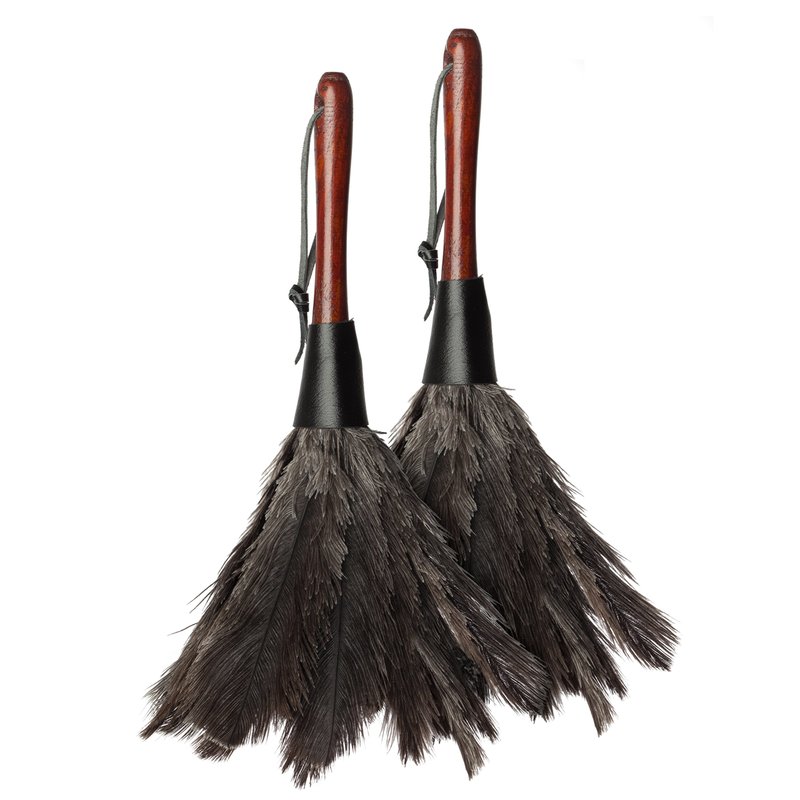 - SET OF TWO - Includes two (2) dusters crafted from varnished pinewood and ostrich feathers; each duster measures 11-3/4-inches long