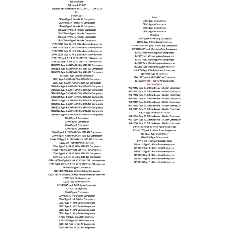 Air Compressors Timing Belt Replaces part numbers: AC-0815 Air Compressor Timing Belt will fit Certain, Dewalt, Devilbiss Package Includes: 3 Pcs AC-0815 Belt