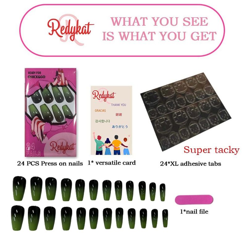 Redykat 24PCS Glossy Coffin Press On Nails, Salon Quality Nail art, Extra Long Acrylic Fake Nails, False Nails, Home Quick Manicure (green&black ombre)