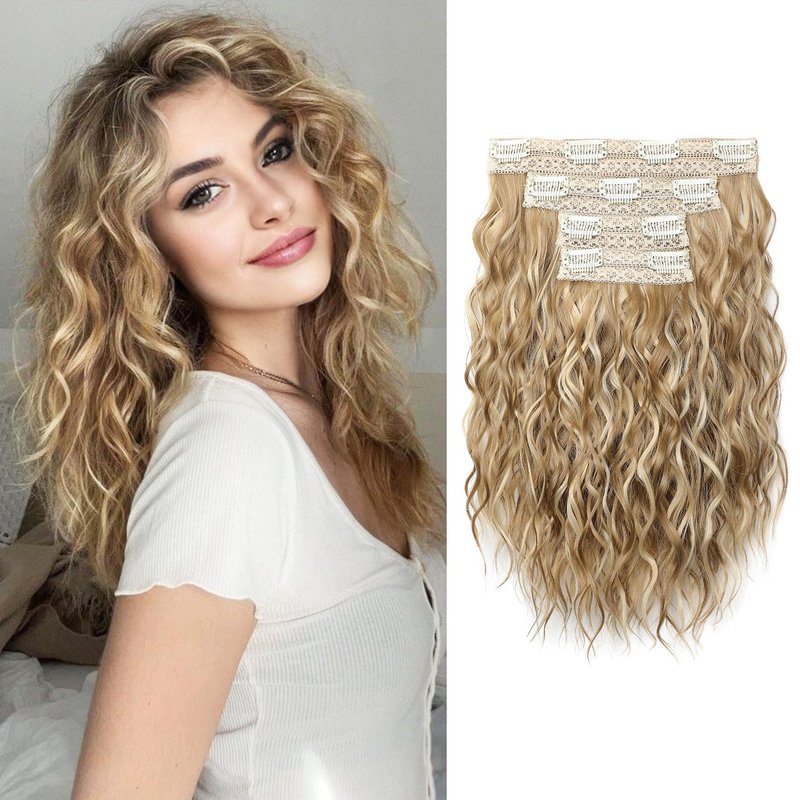REECHO Clip in Hair Extensions, 4PCS Hair Extensions 12" Short Curly Wavy Blonde hair extensions Invisible Lace Weft Natural Soft Hairpieces for Women – Golden Blonde with Highlights