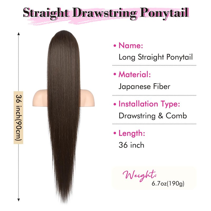 REECHO Ponytail Extension Long Straight Drawstring Fake Pony Tails Hair Extensions Natural Soft Hairpieces Clip Hair Extension Ponytails for Women Girls, 36 Inch/Black Brown