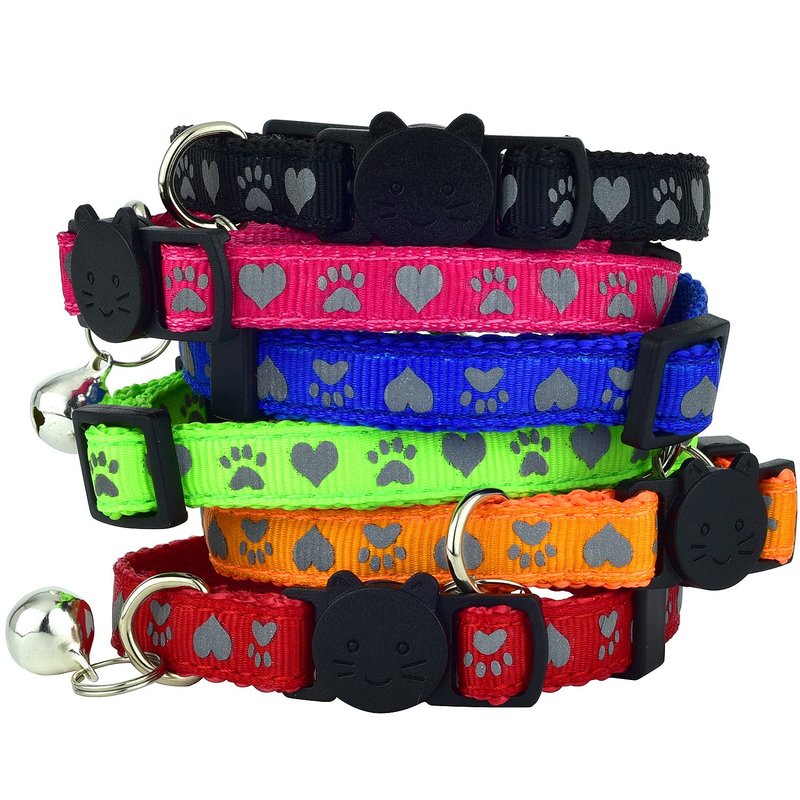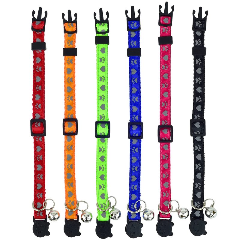 NEW & IMPROVED 6-PACK - Our cat collar set contains 6 high quality cat collars of different colors (red, blue, orange, green, purple, pink) HIGH QUALITY KITTY COLLARS - Our reflective cat / dog collar is solid, made of nylon. Comes with bells. WORKS ON MANY PETS - Great collars for cats and small dogs and other small pets as well. ADJUSTABLE SIZE - The size of the Breakaway Cat Collars is 7-11" (adjustable range)