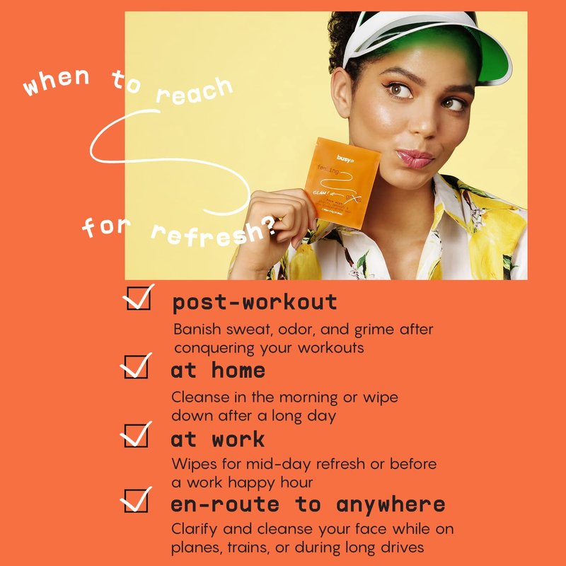 - Busy But Beautiful: Feel refreshed, gorgeous, and radiant right after your toughest workouts or a long, tiring day. Allow these face and eyelid cleansing wipes to calm and soothe signs of distress with the help of Calendula. We also packed these simple wipes with Glycolic acid to help visibly reduce fine lines, wrinkles, and hyperpigmentation.
