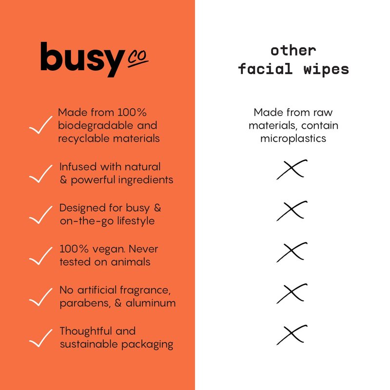 - More Time for You, Less Stress on the Earth: Busy was born because our founder was fed up with unfair beauty expectations alongside makeup cloth and organic wipes that weren't up for the job. Jamie decided to create her own line of face cleaning wipes packed with nature's powerful actives and carefully-studied ingredients. Conveniently packaged travel size wipes that won't end up in landfills or oceans.