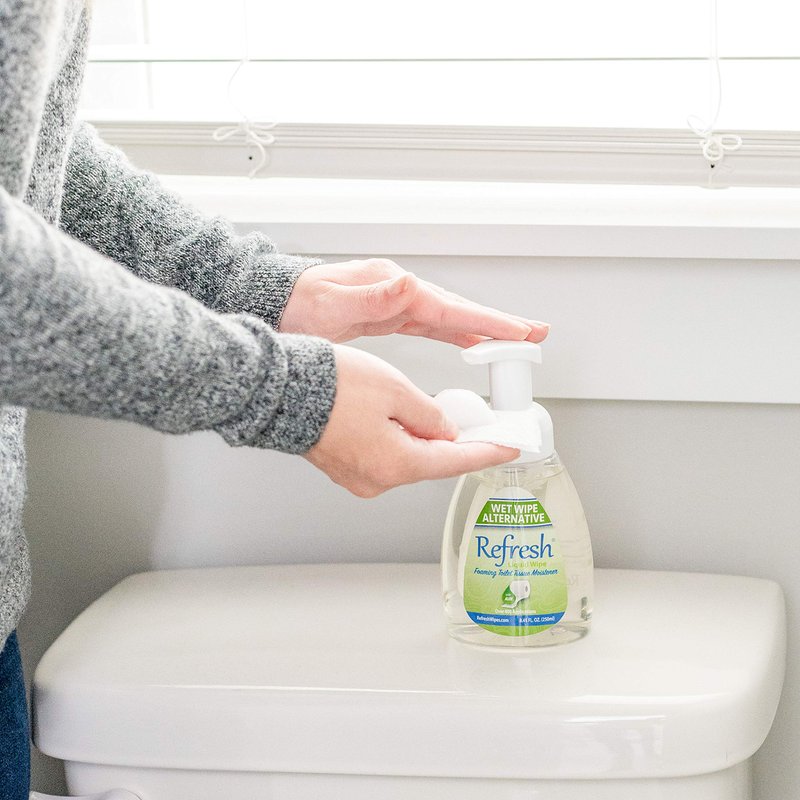 Refresh Liquid Wipe Toilet Paper Foam is The Original Flushable Wet Wipe Alternative that you Use Directly on Toilet Paper to Create a Custom Wipe! Formulated with Witch Hazel and Aloe to Cleanse and Soothe, Refresh Foam produces a foam that stays on top of toilet tissue for over a minute, allowing you to add a little or a lot depending on your personal preference. Refresh Spray applies a fine mist across folded toilet tissue similar to a standard wipe. Standard flushable wipes come pre-soaked and they have to be strong enough to remain intact for use, which is why they cannot break down like toilet paper moments after being flushed. Also, you cannot customize the level of moisture with a standard flushable wipe the way you can with Refresh Liquid Wipe and toilet paper. Original Formula for normal skin types is lightly scented. The Alcohol-Free formula is perfect for sensitive skin types and it contains no parabens or added fragrance. Refresh Liquid Wipe Toilet Paper Foam Cleanses and Soothes to greatly enhance your personal hygiene routine because it Cleans Away what plain toilet paper leaves behind. Convenient Personal Size 50ml (1.69 oz) Foam and 2oz Spray bottles fit discretely in your pocket or purse and provide hundreds of applications. They provide roughly the same uses and cost about the same as a 50 pack of competitive flushable wipes. Economical 250ml (8.45 oz) Household Size contains four to five times as much Refresh as the personal size bottles at a fraction of the cost per use. The 8 oz Refill allows you to refill your bottles and it can be used in any automatic foam dispenser. Zero-waste, sustainable, and packaged in recyclable containers. Perfect for travel, office and at home. A must have for freshening up after a workout or road trip. Great for boaters and RVers, campers, runners and hikers.