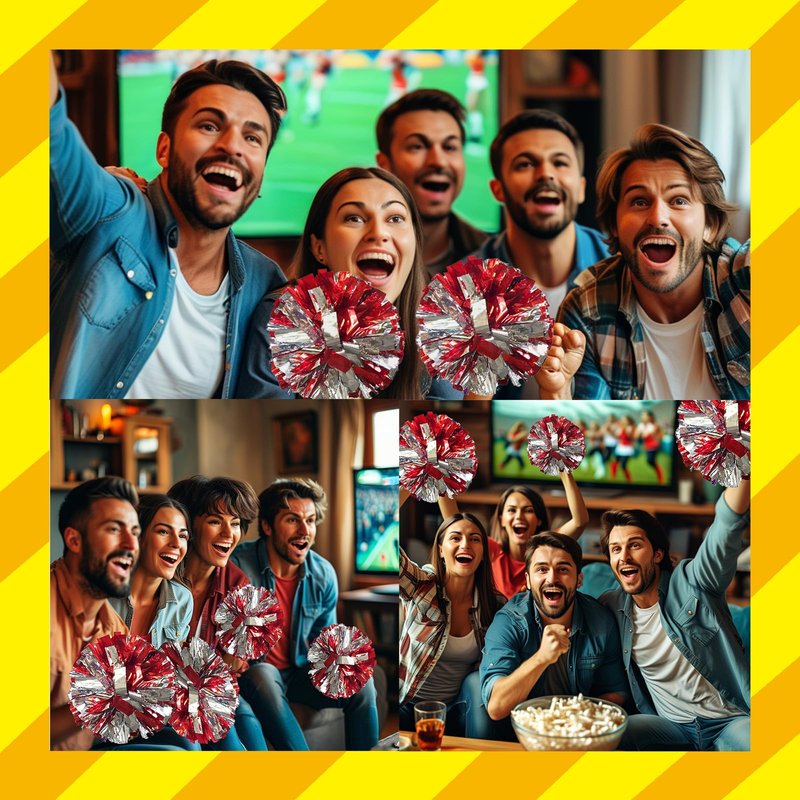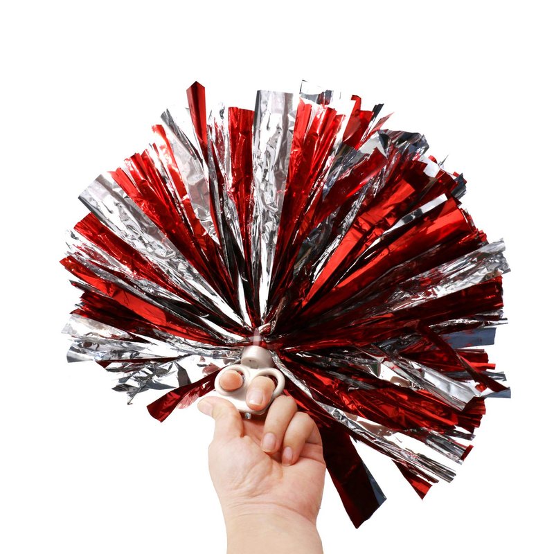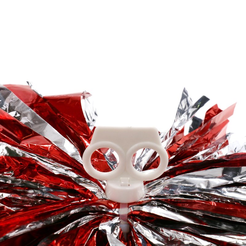 - Cheerleading pom poms in eye-catching red and silver metallic foil with smooth, comfortable ring handles, perfect for cheerleaders, dancers, and performers.