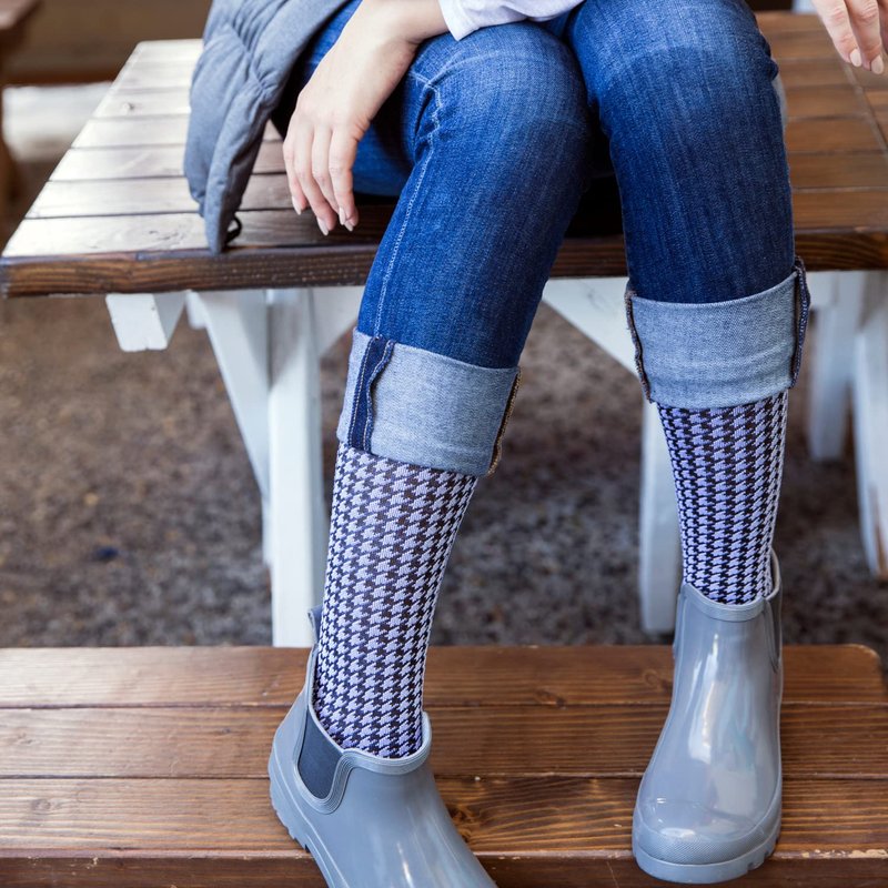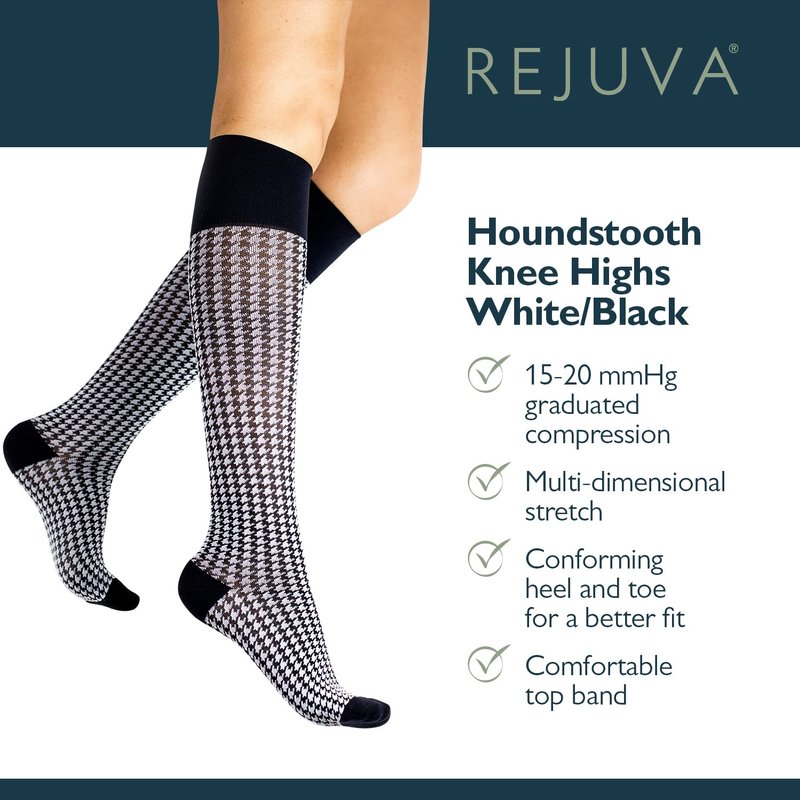 - KNEE HIGH COMPRESSION SOCKS: Featuring a blend of 75% nylon and 25% LYCRA spandex, these Houndstooth socks from Rejuva are perfect for those who need to make a statement. Their graduated compression helps relieve moderate foot and leg ailments.