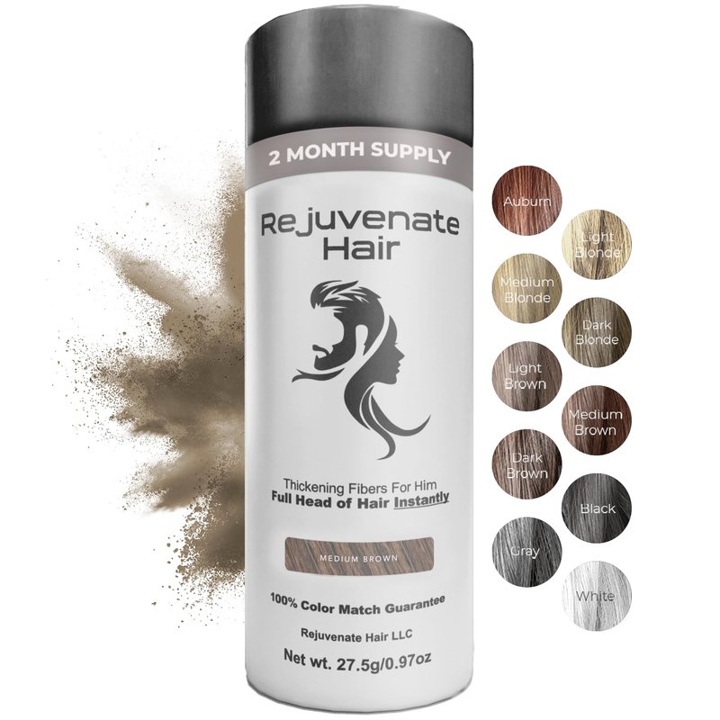 - NATURAL & UNDETECTABLE HAIR LOOK - Rejuvenate Hair's hair fiber powder blends seamlessly with your hair to provide the perfect coverage for thinning areas, hairline or bald spots. Our hair fibers for thinning hair save you money by providing a cost-effective solution to hair pieces, wigs, and clinics.