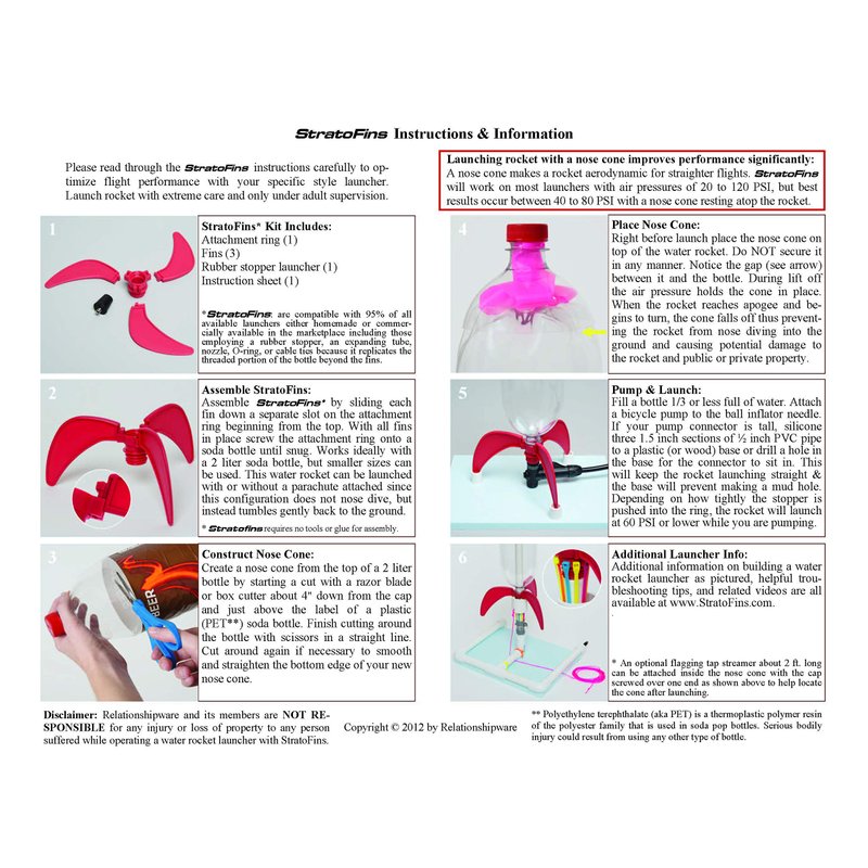 StratoFins will guide your rocket to lofty heights with straight flights instead of tumbling through the air. StratoFins are made of durable plastic and screw-on to a 2 liter soda bottle or smaller. This version ships with a rubber stopper launcher for a complete economical package. These fins are compatible with 95% of all available launchers either homemade or commercially available in the marketplace if you want to upgrade the launcher at a later time. StratoFins requires no tools or glue for assembly. The StratoFins kit includes 1 attachment ring, 3 fins, 1 rubber stopper launcher along with an instruction sheet that provides information for creating a nose cone and several launching tips. Assemble StratoFins by sliding each fin down a separate slot on the attachment ring beginning from the top. With all fins in place screw the attachment ring onto a soda bottle until snug. This water rocket can be launched with or without a parachute attached since this configuration does not nose dive, but instead tumbles gently back to the ground provided the nose cone is not permanently attached. Great item for people of all ages for fun, science projects, school classes, parties, etc.