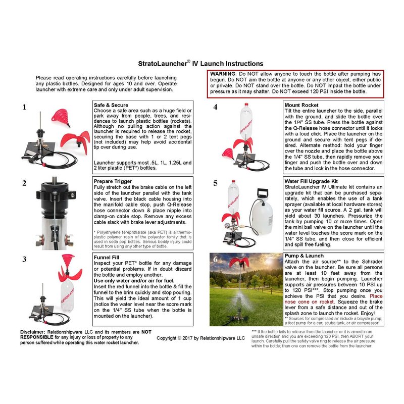 Our StratoLauncher IV kit includes a water rocket launcher made of aluminum, stainless steel, durable plastic, & brass parts, a set of StratoFins & collapsible water fill funnel. Assembly is quick & easy with no further adjustments required regardless if you use our StratoFins or your own homemade rocket or FTC (Fluorescent Tube Cover) rocket thanks to the screw-on nozzle. Employing a nozzle makes this a universal launcher for most any style water rocket and eliminates problems such as bottles not fitting over a launch tube, O-rings wearing out, or accidental launches due to falling collars. The restricted nozzle facilitates lift offs that are 3 – 6 times slower (depending on PSI) than typical water rocket launchers enabling you to see the blast off and yet the nozzle rocket will fly equal to or higher in altitude. Also, the nozzle requires only 1 cup of water per launch for optimum performance although you are free to experiment. StratoLauncher IV ships unassembled with a QR code on the box label that you can scan with your smartphone to view a PDF containing assembly instructions, launch procedures, upgrade kits, videos, and future accessories. NO additional materials are required for assembly, but you will need an adjustable wrench (or a 14mm wrench), 4 & 5mm hex wrench, & a Phillips head screwdriver. Our StratoLauncher IV will enable you to propel a 2 liter soda bottle over 350 ft. into the sky using only water and compressed air from a bicycle pump or an air compressor. Fuel (water & air) is essentially free and readily available allowing countless launches without additional expense. You control when the launch occurs by squeezing the black lever and releasing the lock at the end of the cable from a safe distance of 10 ft. and out of the splash zone. StratoLauncher IV comes in 3 models: Standard, Deluxe, and Ultimate. Any of them can be upgraded to add additional features and all come with a 125 PSI safety valve to prevent exploding bottles while pressurizing.