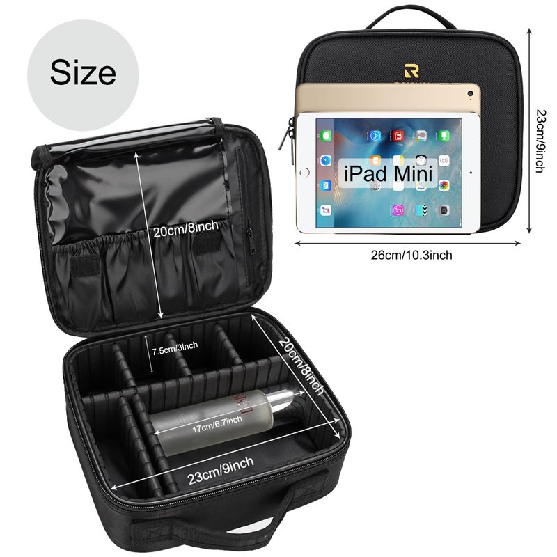 100% Satisfaction Guarantee. WORRY FREE! ORDER NOW! Any problem please feel free to contact us. Unrivalled quality: Our make up Organizer will look just like new even after a long time use due to its durable and waterproof material. It is very suitable for travel, business trip or use at home.Fit in your suitcase About the product * Delicate Looking& Workmanship. The tidy and fine close stitching ensure the Makeup Organizer bags are sturdy and durable. * You can Design Yourself internal compartments by the adjustable padded dividers. * Lightweight & Easy to Carry. Ideal for taking exactly what you need, anywhere, at any time. * Fantastic solution to store jewelry, toiletry, makeup paraphernalia like lipstick, makeup brush, eye shadow, nail polish, eyeliners. All women's essentials in one elegant case. * Detachable part and divided section to keep all the necessities neat and in order. * Easy to Clean: Black Foamed oxford Insulate Lined for Easy Cleaning. * Great Gift Idea: Amazing gift for family, friends, co-workers, presentations, birthdays, holidays and more. * Durable with water proof, shake proof, anti-wear and spill-proof interiors for long use Size: 10.3 X 9 X 3.5 Inches Weight: 1.6 lb What's in the Box: 1pcs of Mini Makeup Train Case 2pcs of large pads (5 IN), 3pcs of small pads (2.6 IN), 1pcs of long pads(10 IN) Note: Cosmetic accessories not included in this item.
