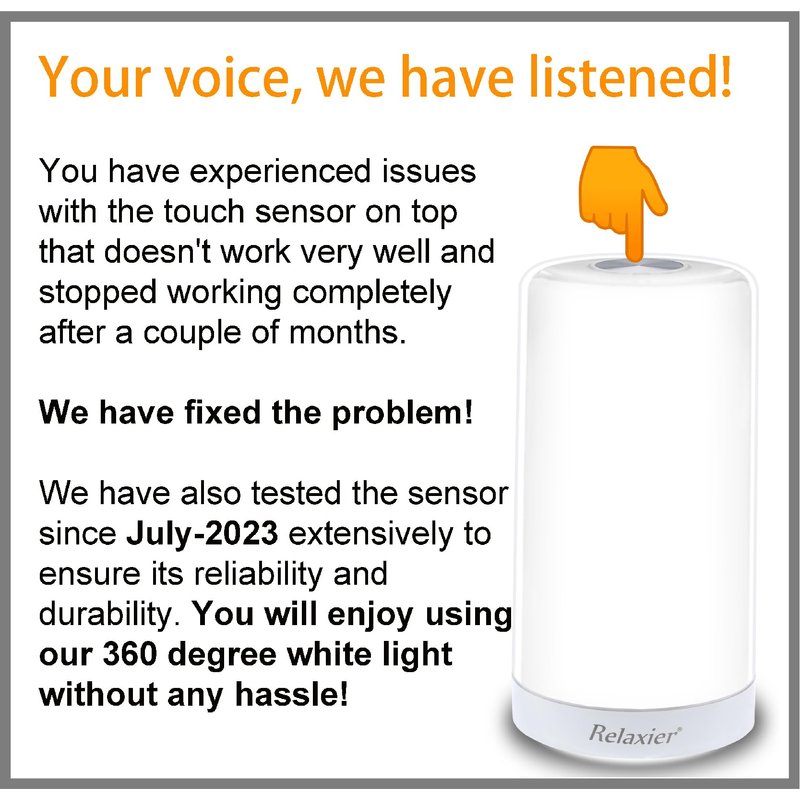 - ENJOY THE SMOOTH AND RESPONSIVE TOUCH SENSOR DESIGN. The Relaxier light therapy lamp has a touch sensor design that lets you adjust the brightness and color temperature with a simple touch. We have fixed the touch sensor issue that some customers reported and made it smoother and more responsive.