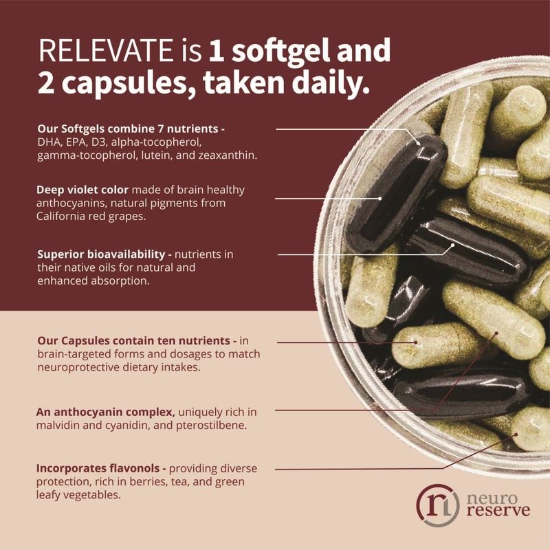 - ELEVATES AN ORDINARY DIET WITH NUTRIENTS YOUR BRAIN MAY BE MISSING: A “brain poor” diet, along with other lifestyle factors, can accelerate cognitive aging. The average American adult consumes less than 50% of the optimum level of brain-healthy foods and nutrients. RELEVATE helps fill those shortfalls. RELEVATE nutrients also support sleep, eye health, immune, cardiovascular, and metabolic health, and may support brain health for APOE4 carriers.* (*Norwitz NG et al. Nutrients (2021))