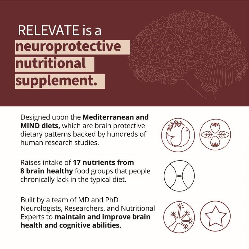 - FOR A SHARPER MIND AND STRONGER BRAIN. Doctor formulated, patent-pending, and backed by rigorous science to support brain health, memory, cognition, and focus - now and for years to come. RELEVATE fills nutritional gaps between what most people eat and evidence-backed neuroprotective diets that are healthiest for your brain. RELEVATE is anti-aging, longevity nutrition for the brain.