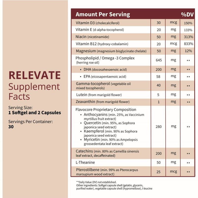 - CONVENIENT, UNCOMPROMISING, AND ABSORBABLE WITH 17 CLINICALLY RESEARCHED NUTRIENTS. For peace of mind. Unlike “nootropics” or “brain boosters,” RELEVATE is the only supplement designed upon the scientific data of long-term brain health from Mediterranean and MIND diets. Contains plant-based antioxidants from green leaf vegetables, berries, and tea, B vitamins, bioavailable omega-3 phospholipids from herring roe, plus absorbable magnesium glycinate, all targeting brain structure and function.