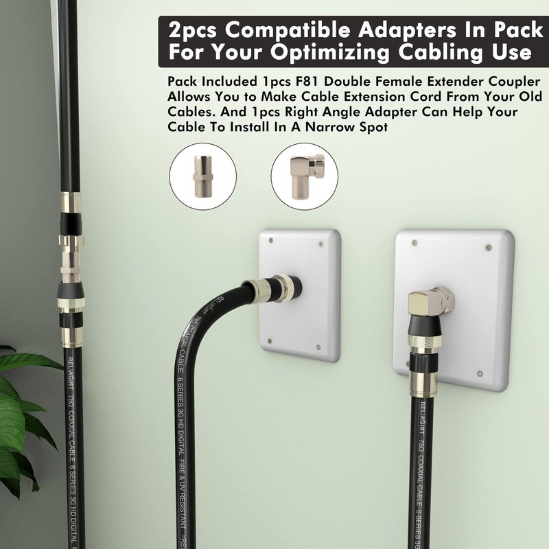 - Compatible Adapters For Your Different Use. Pack Included 1pcs F81 Double Female Extender Coupler Allows You to Make Cable Extension Cord From Your Old Cables. And 1pcs Right Angle Adapter Can Get Your Cable To Install In A Difficult Spot.