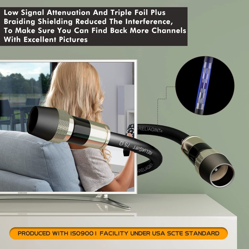 - Produced With ISO9001 Facility Under USA SCTE Standard, Low Signal Attenuation And Triple Foil - Braiding Shielding Reduced The Interference, To Make Sure You Can Find Back More Channels With Excellent Pictures.