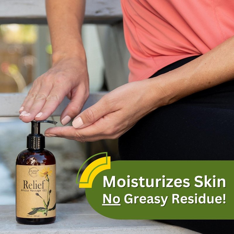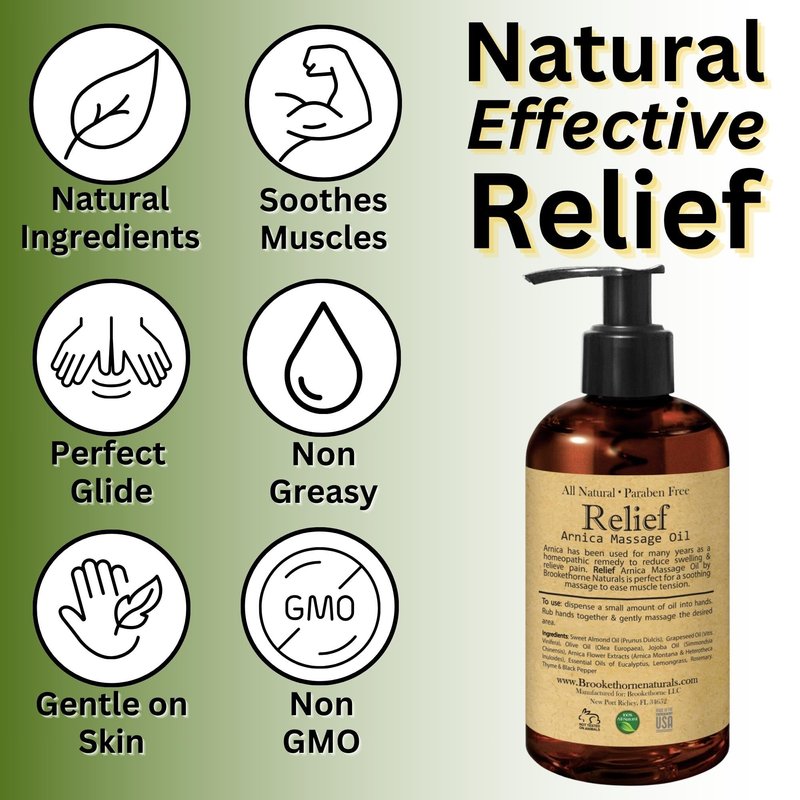 - Want real relief without having to leave your house? Relief Body Massage Oil is perfect for in home massage too! Enhanced with Arnica Montana this natural massage oil provides sore muscle relief & overall relaxation to help you feel your best!