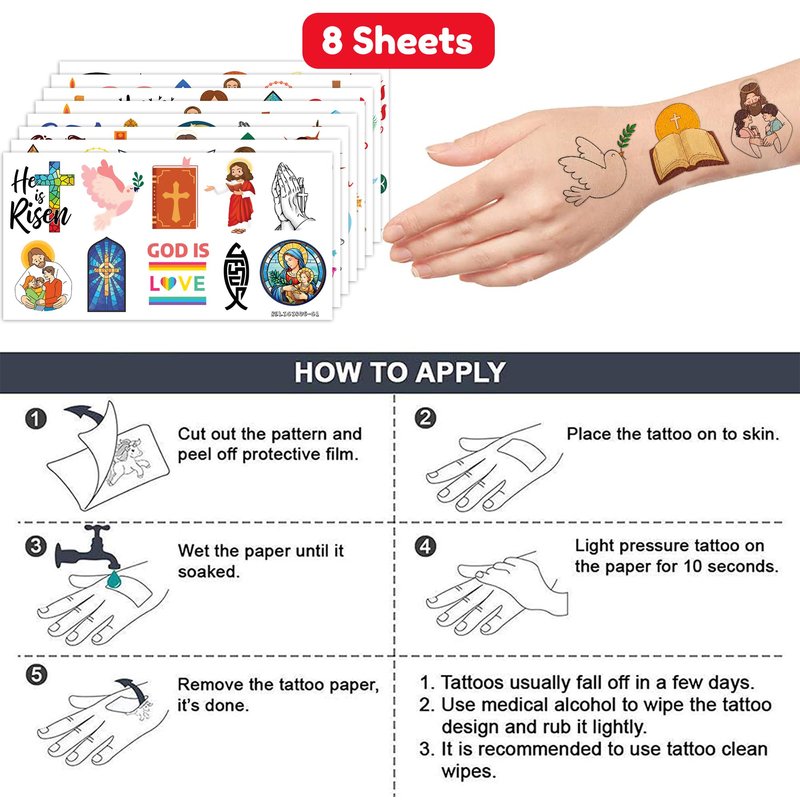 - 🎉[PERFECT PRESENTS FOR RELIGIOUS CELEBRATIONS]]: Infuse spiritual significance into your celebrations with these religious tattoos. Decorate using these tattoos and receive numerous compliments for your themed event setup. These religious tattoos serve as delightful tokens that you shouldn't overlook for your special occasion.