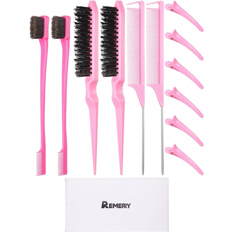 Remerry 12 Pieces Hair Brush Set, Nylon Teasing Hair Brushes 3 Row Salon Teasing Brush, Double Sided Hair Edge Brush Smooth Comb Grooming, Rat Tail Combs with Duckbill Clips for Women(Pink)