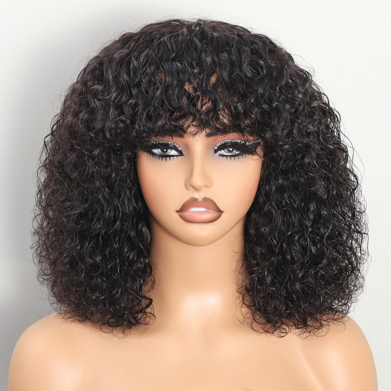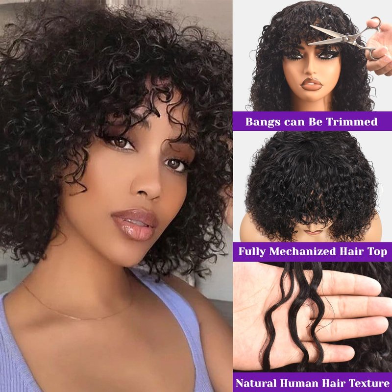 - 【Wigs Advantage】Short curly bob wig human hair with bangs, Machine Made Wigs, No glue, Beginner friendly ,very easy to self install and care, Wear and go! Healthy & Comfortable & Breath.