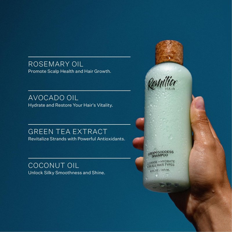 - Gently Cleanse Your Scalp: Remilia Green Goddess Shampoo contains a scalp-strengthening formula for dry, damaged hair. This green shampoo contains pure rosemary oil, balancing your scalp, thickening hair and adding volume for all hair types.